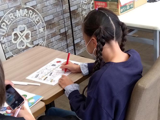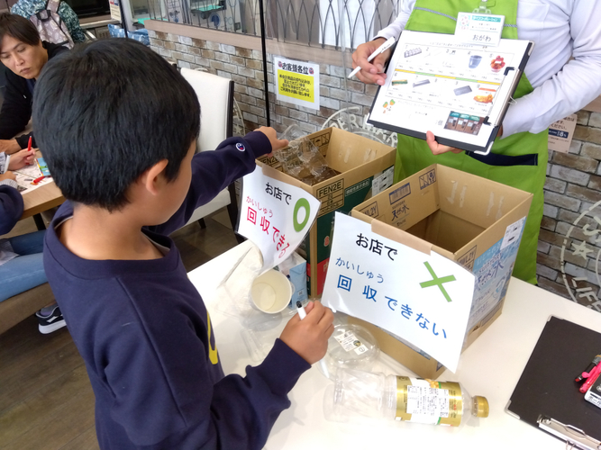 さらに、店頭のリサイクルBOXで回収している資源について、様々な容器を”回収できる物””回収できない物”に分ける「資源分別ゲーム」を行い、資源リサイクルについての理解を深めていただきました。