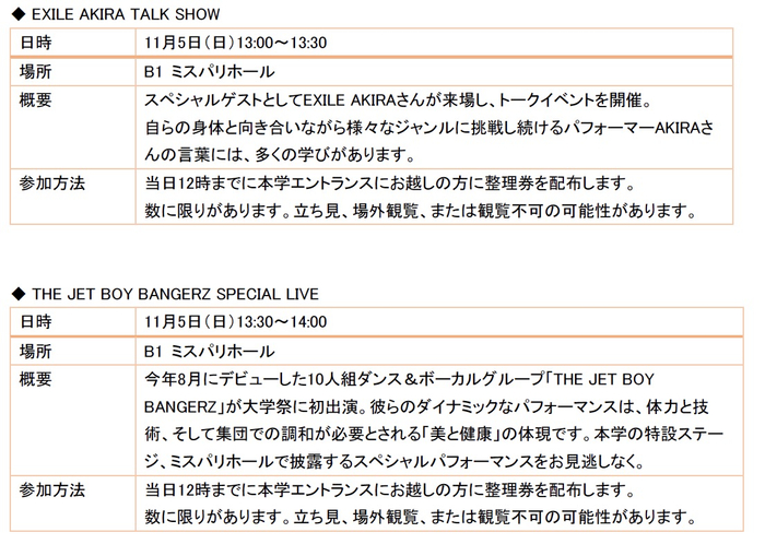 また、5日(日)は、スペシャルゲストとしてEXILE AKIRAさんが来場し、トークイベントを開催します。そして今年8月にデビューしたLDH JAPAN所属の10人組ダンス&ボーカルグループ「THE JET BOY BANGERZ」が、本学のミスパリホールでスペシャルパフォーマンスを披露します。