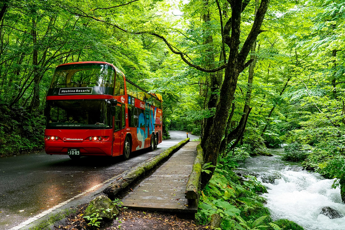 奥入瀬渓流(おいらせけいりゅう)沿いに建つ唯一のリゾートホテル「星野リゾート 奥入瀬渓流ホテル」は、2020年10月1日~16日の期間、青森県の観光を応援すべく、「渓流オープンバスツアー」一般開放を実施します。オープンエアの2階建てバスで渓流沿いを走行するため、森のトンネルを走り抜ける爽快感や、約3mの高さから見る渓流の絶景を存分に楽しめます。青森県民なら一度は来たことがある奥入瀬渓流を新たな目線で味わい、その魅力を再発見できるツアーです。