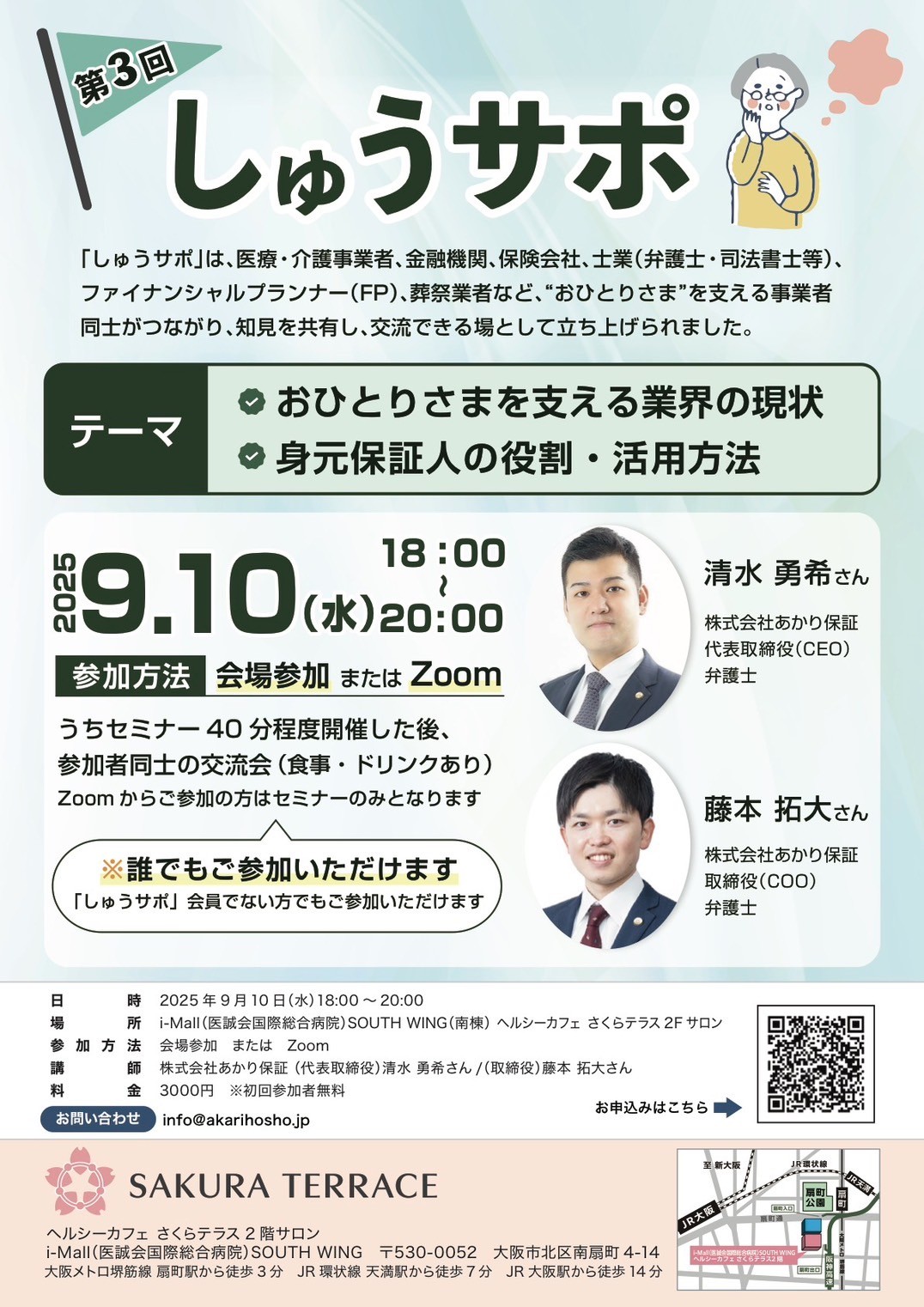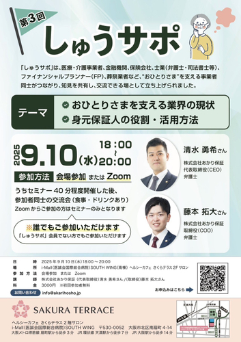 医療複合施設「i-Mall」(医療法人医誠会 本社:大阪府大阪市、代表:谷幸治)内、医誠会国際総合病院併設のヘルシーカフェさくらテラスで、9月10日(水)『おひとりさまをサポートする事業者コミュニティ 第3回「しゅうサポ」』(主催:株式会社あかり保証)を開催いたします。