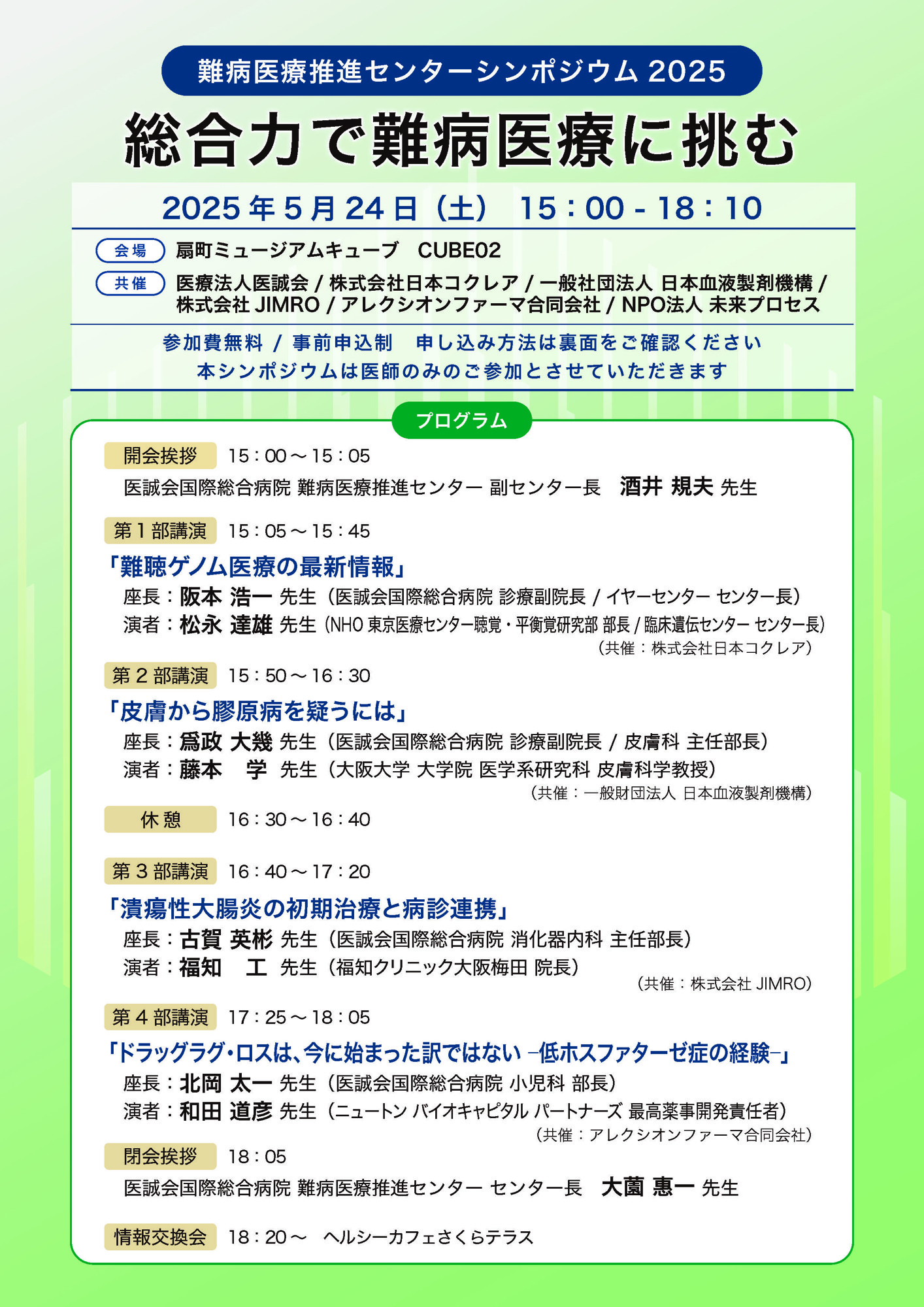 共催:医療法人医誠会 / 株式会社日本コクレア / 一般社団法人 日本血液製剤機構 / 株式会社JIMRO / アレクシオンファーマ合同会社 / NPO法人未来プロセス