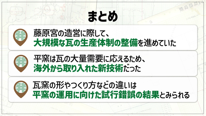 2023年5月から8月にかけて、奈良文化財研究所は、藤原宮の瓦を生産した、日高山瓦窯の発掘調査をおこないました。この動画では、その調査成果と意義について、わかりやすく解説します。