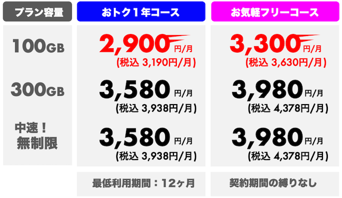100GB,300GB,無制限と利用シーンに合わせて選べる納得の新価格!