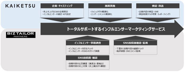 本サービスではKAIKETSUが持つ独自の分析ツールを使い、最適な企画策定・インフルエンサーのキャスティングを行い、施策を実施し企画内容の検証まで実行します。この一連で発生するリスクをビズテーラー・パートナーズが審査・監視することで、リスクを低減した運用を実現いたします。