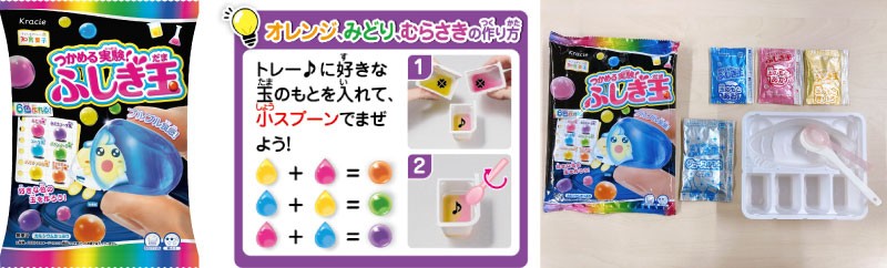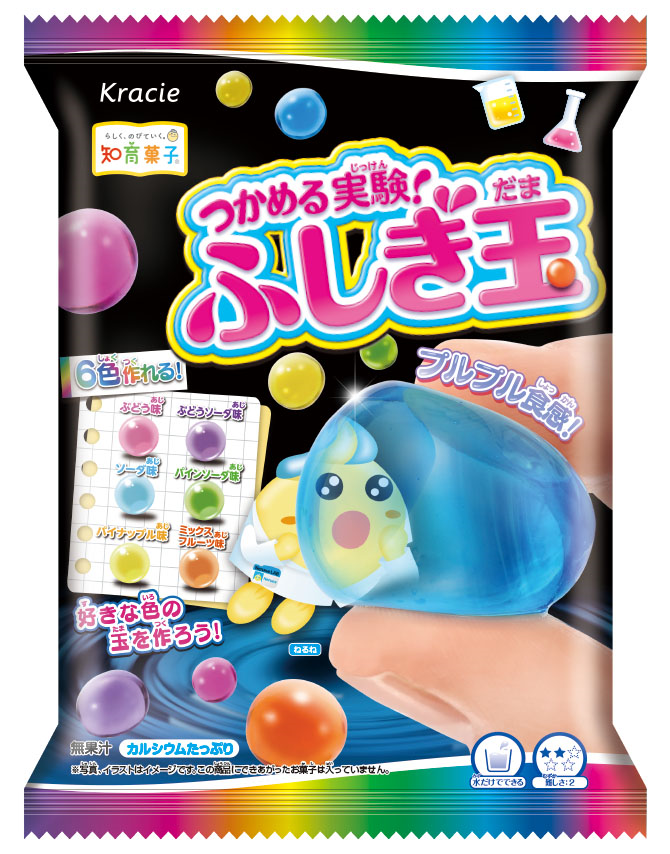 「つかめる実験!ふしぎ玉」は、粉と水を混ぜることで、液体が手でつかめる「ふしぎ玉」を作ることができる実験要素たっぷりの知育菓子®です。プルプルの水の玉をつかむという驚きの体験と、見た目の楽しさ・味わいが重なり合い、2018年の発売以来、多くのお子さまや保護者の方々に親しまれてきました。