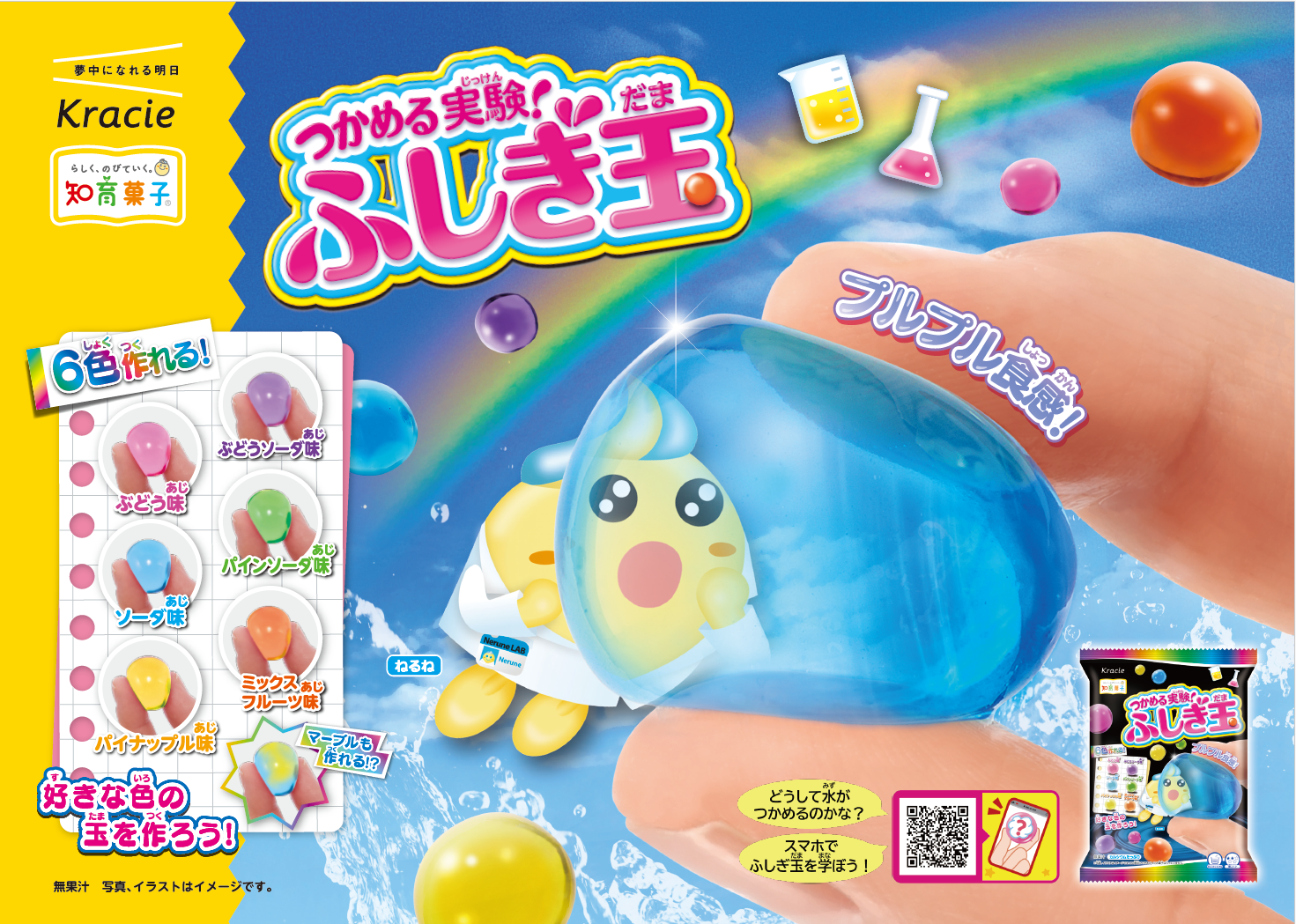 この商品の最大の特長は、「手で液体をつかむことができる」という点です。普段はつかんだり持つことができない液体を、「ふしぎ玉」としてつかんだり、手のひらに乗せたりと自由に触れることができるので、不思議な実験体験を楽しむことができるお菓子として、これまでも多くのお子さまに楽しんでいただきました。