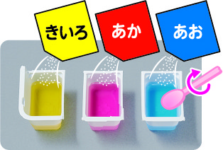 そのため今回のリニューアルでは、「あか・あお・きいろ」の3原色から、「オレンジ・みどり・むらさき」を作って楽しめるように設計を見直し、最大6色のふしぎ玉を作れるようにしました。色のバリエーションが一気に広がることで、見た目の楽しさも、体験の自由度も大きく向上しています。