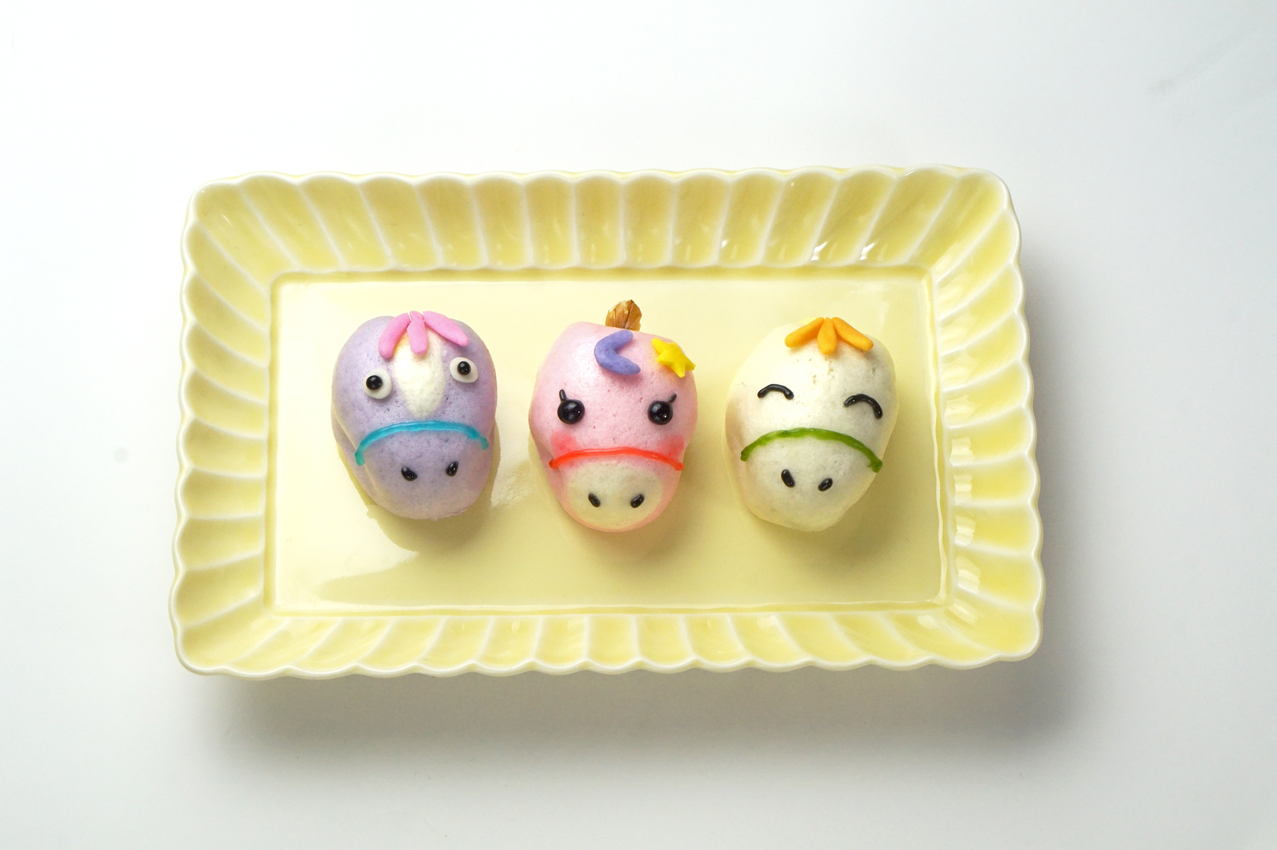 『ウマくいって ニコニコ~ん!』はそれぞれ異なる願いを託した3匹のユニコーンまんじゅうの詰め合わせです。