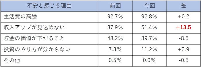 2.不安と感じる理由で「収入アップが見込めない」と回答した人は13.5ポイント増加
