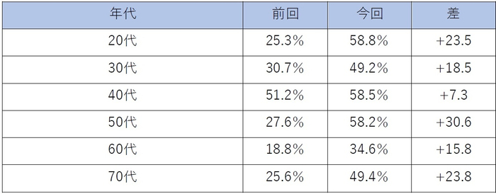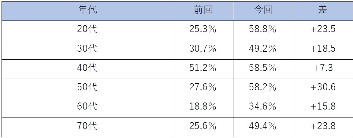 なかでも20代が53.9%と最も高く、全世代の中で唯一50%を超える結果となりました。前回の調査でも20代は48%と高い数字でしたが、さらに5.9ポイント増加しました。20代は「FIRE」への関心も高い世代であり、自分で資産を作ることに対しての意識が高く、インフレに対する動きも積極的なのだと考えられます。