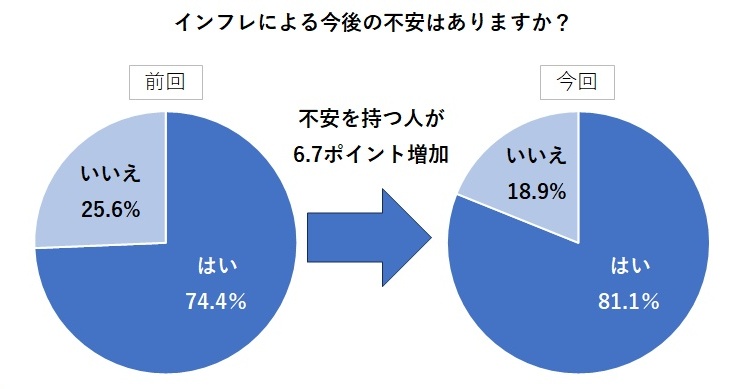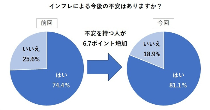 「インフレ(物価上昇)による今後の不安はありますか?」。この質問に対して、「はい」と回答した人は550人中446人で、全体の81.1%にも上りました。2022年8月に行った1回目の調査では、同じ質問に対して「はい」と答えた人は74.4%だったため、インフレに不安を感じている人が前回よりも6.7ポイント増加したことになります。