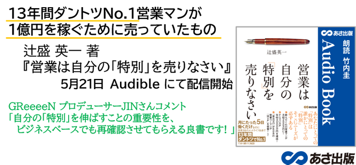 株式会社あさ出版(代表取締役:田賀井弘毅、所在地:東京都豊島区)は、世界最大級のオーディオブック及び音声コンテンツ制作・配信サービスであるAmazon Audible(以下オーディブル)にて、辻󠄀盛 英一 著『営業は自分の「特別」を売りなさい』( https://amzn.to/3MyMXBO )のオーディオブックの配信を2022年5月21日に開始いたします。