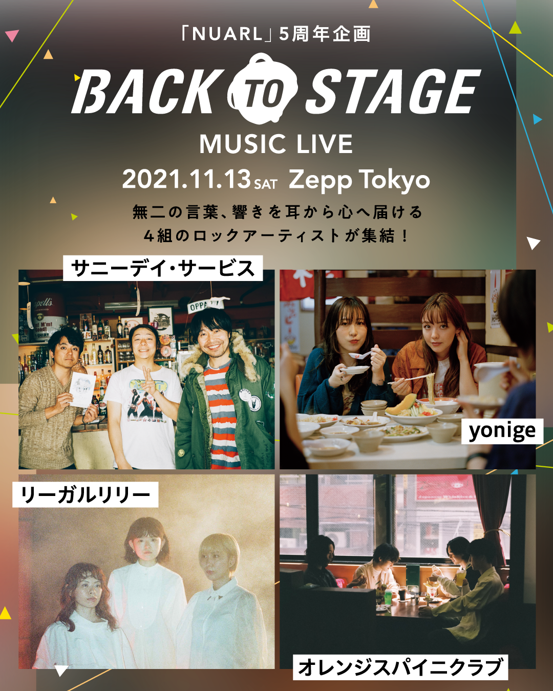 皆様のご支援により「NUARL」は2021年11月1日で5周年を迎えることになりました。その感謝の気持ちを込めて、この度5つの記念企画を実施致します。その第一弾として、コロナ禍の影響により打撃を受けている音楽業界への応援企画「BACK TO STAGE」より、有観客でライブステージをお楽しみいただける今回限りの “NUARL MUSIC LIVE 「BACK TO STAGE」”を、2022年1月1日(土)を以て営業終了となる東京お台場の「Zepp Tokyo」にて開催することと致しました。