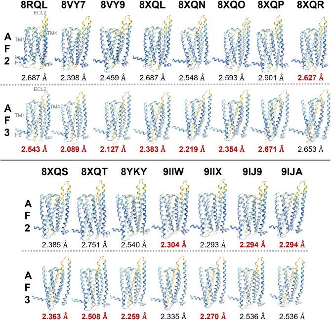 T2R14の実験構造と、AlphaFold2(AF2)およびAlphaFold3(AF3)による予測構造の比較(発表論文Fig.4から)