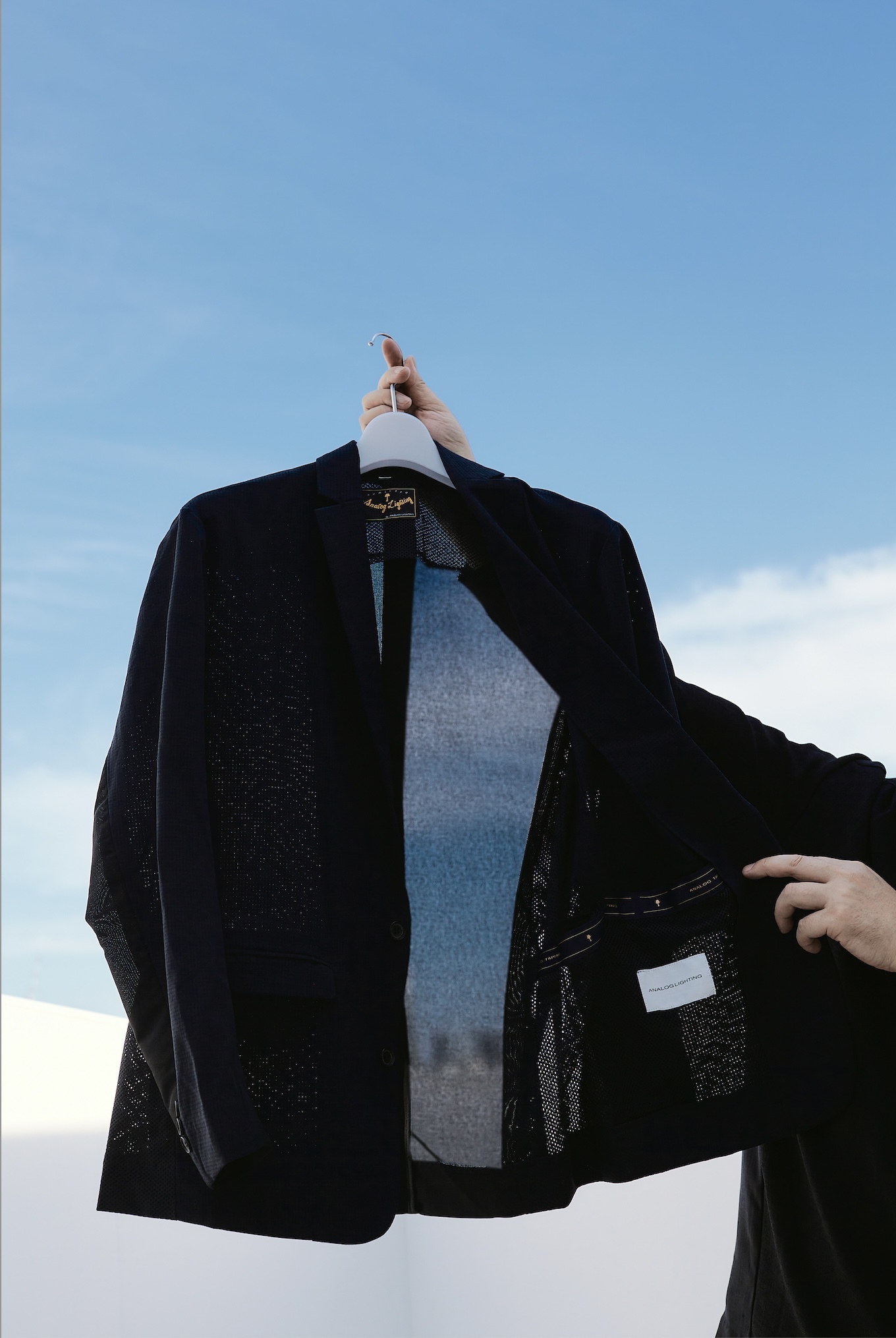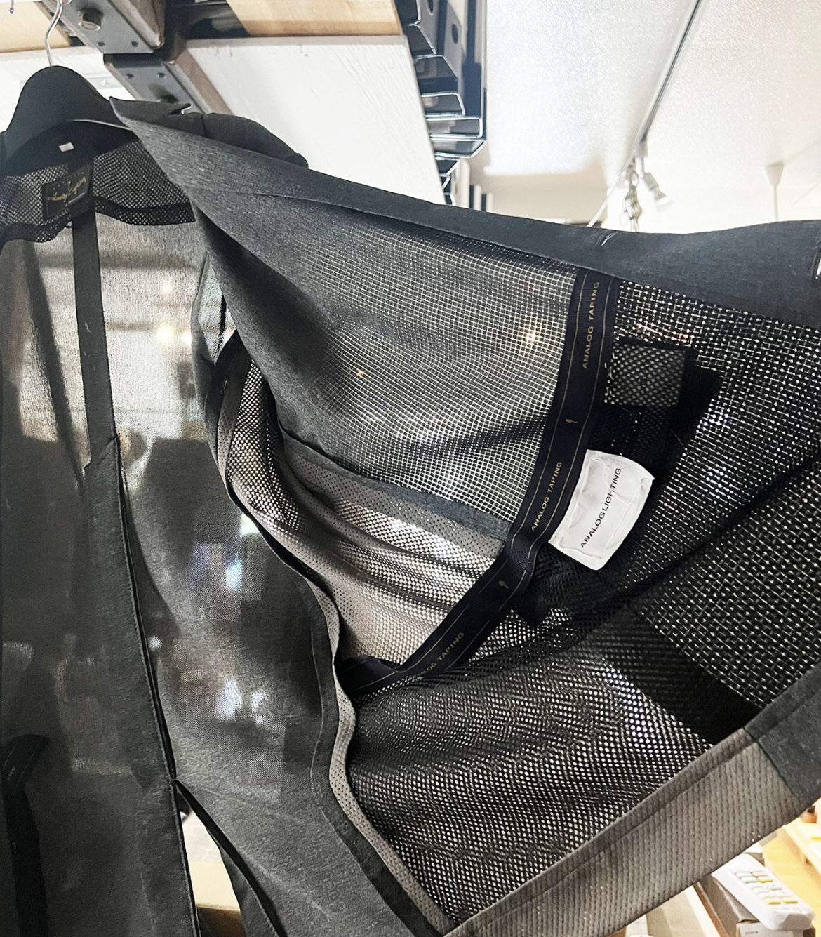 近年の異常な猛暑の中スーツを着て暑そうにしている人々を見て、ファッションで解決できるのではと思い立ち、制作しました。ヒントになったのは日本の伝統的な蚊帳(かや)。虫は通さないのに風を通し日陰を作り中に居ると涼しい、蚊帳のようなメッシュ素材でスーツを作ることを思い付きました。ギリギリまで中が透けない素材を見つけるのに難航しましたが、農業用ネットやカーテンのメッシュ素材など世の中のあらゆる素材を試して今の素材に行き着きました。