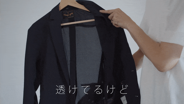 空にかざすと後ろの景色が透けて見えますが、4種類の目の粗さやパターンの違うメッシュを場所によって使い分けていることで、着た時は透けることがなくビジネスシーンで活用ができます。特徴は軽さと速乾性。ジャケットは一般的な夏用スーツの半分以下の軽さで、まるで着ていないかのような着心地。そのため洗濯しても日中なら30分以内に乾きます。汗だくになって洗濯してもお昼休みの間に乾いてしまう程の急速乾性能。
