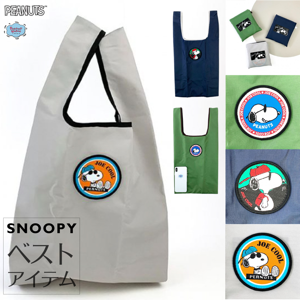 お待ちかねのスヌーピージョークールのワッペン付きエコバッグ♪抗菌防臭のバイオライナー生地で登場