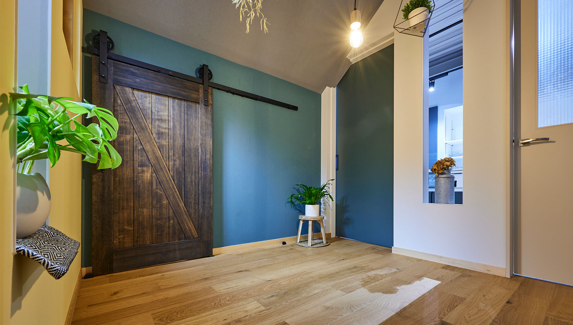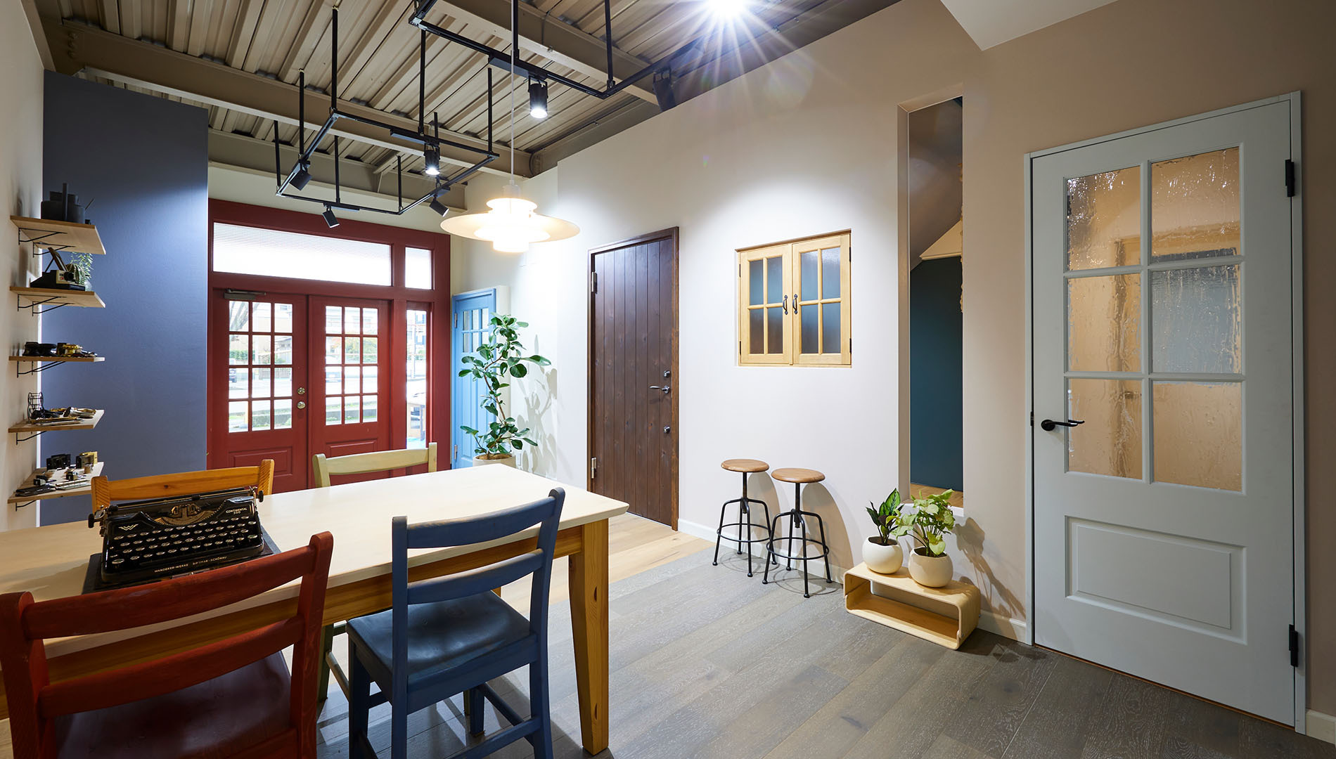 サイズオーダーできる木製ドア「Nオーダードア」と個性的なバーンドアレールを組み合わせた実例も展示。屋根裏のようなおこもり空間を再現し、色彩豊かな壁紙も組み合わせ、個性を表現できる建材を提案しています。