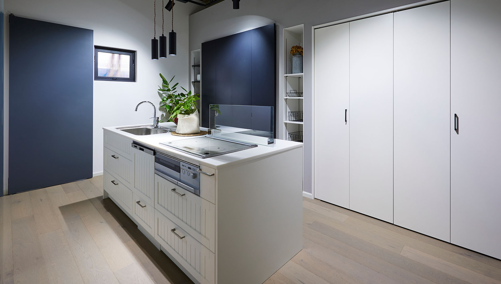 キッチンはスタイリッシュモダンな空間に。ナガイのオリジナルキッチン「VESTA Kukkaシリーズ」は框スタイルの面材と上質な塗装仕上げが特徴。塗装ならではの質感・色合いが人気です。キッチンは、VESTAのなかでもスタイリッシュなデザインの「デザイナータイプ」。それに合わせてモノトーンを基調にしたモダンなインテリアを演出しました。