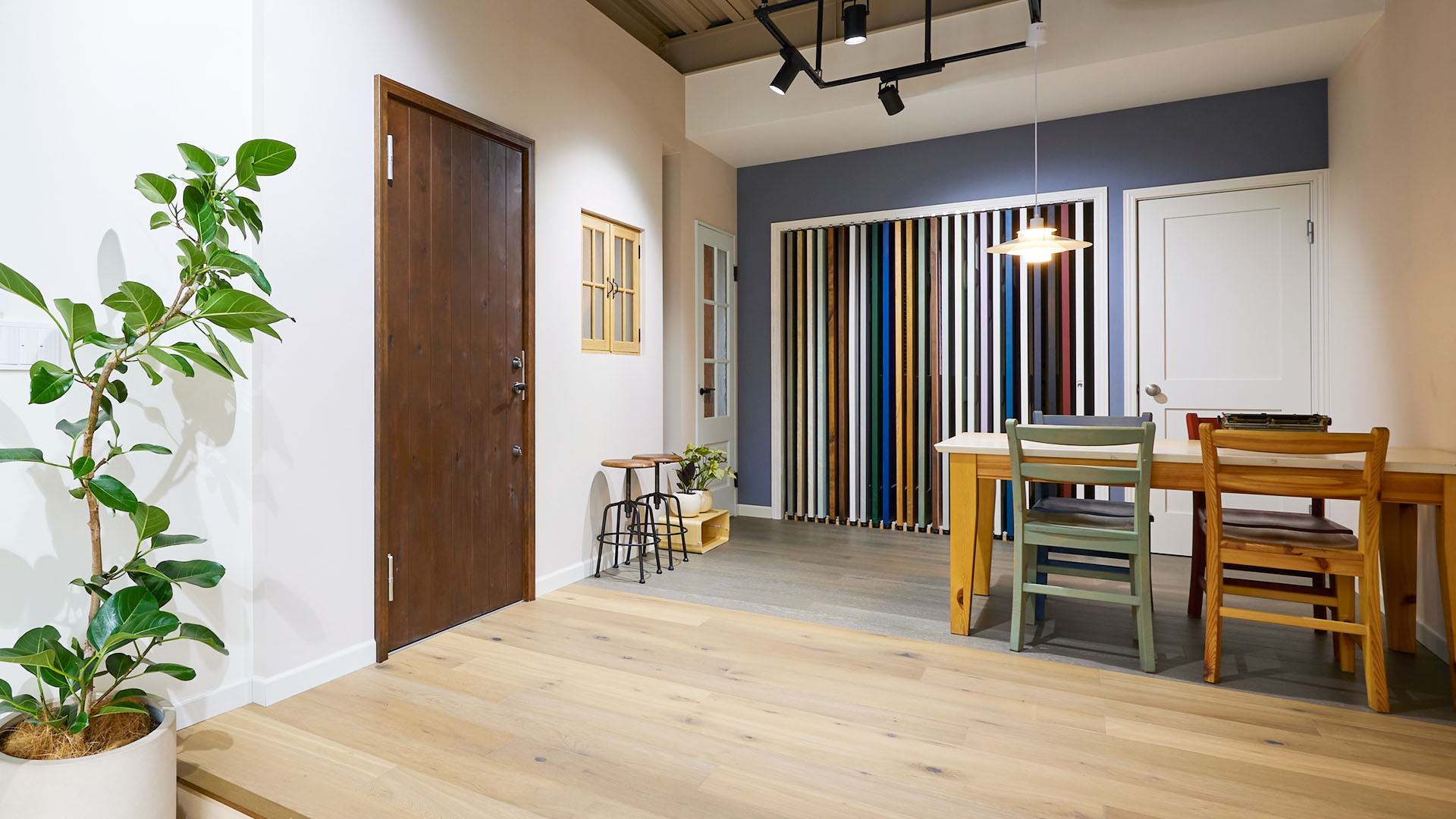 メインルームでは、落ち着いた空間で木製ドアやフローリングなどをゆっくりとご覧いただけます。なかでもナガイの人気商品である木製ドア「innoa」は、豊富なデザインや塗装仕上げが特徴。5,000以上のパターンの中から、おすすめのデザイン・カラーの組み合わせをご用意しております。