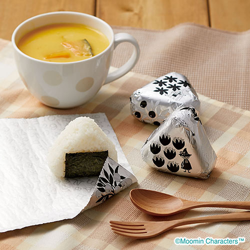 外に持って出るおにぎりを美味しく楽しく包むおにぎり専⽤ホイル「おにぎりホイル」は弊社でも⻑年愛されている商品です。そのおにぎりホイルにかわいいムーミンのデザインを追加!サンドイッチを包んだり、ランチボックスに敷いてもGood!さらに、製品のシート素材にFSC®認証紙(注1)を新採⽤で環境にも優しい商品です。