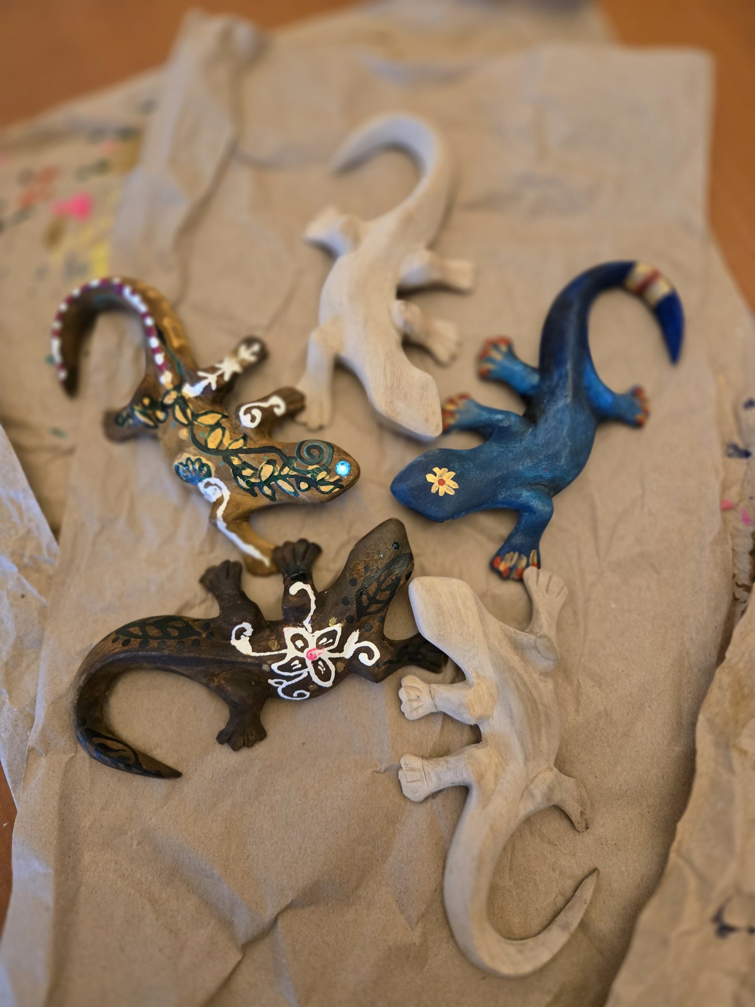 インドネシア・バリ島孤児施設の子どもの絵と地元職人手彫りの木製ヤモリの絵付け体験他、チャリティーグッズの販売。