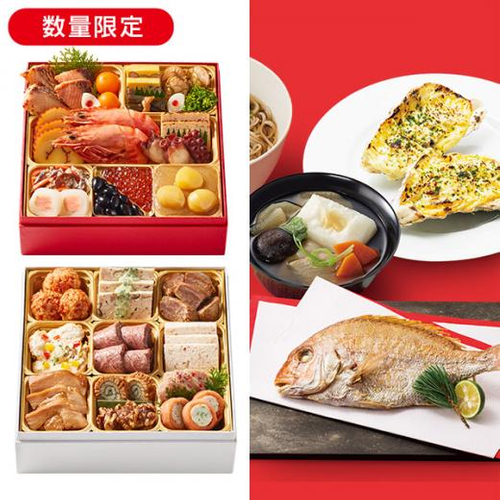 伝統的なおせち、肉料理、魚料理を和洋バランスよく詰め合わせたSONOKOのおせち重。お祝いの席にふさわしい紅白のお重箱です。