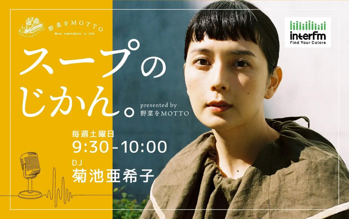 菊池亜希子さんをDJとして迎えたラジオ番組「スープのじかん。」が4月より放送開始。ぐつぐつコトコト?...素敵なゲストとのおしゃべりを煮込む"おいしい"トークプログラムをお届けします。毎週土曜日9時30分~10時の30分間、日常で感じる些細な瞬間や身近なトピックをテーマに他愛もない会話を聞いているような空気感と、体もココロもほぐれるスープのような時間をお楽しみください。