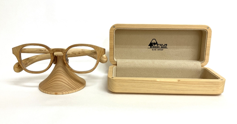 製品には富士山檜材を使用した木製ケースと富士山型メガネスタンドが付属し、眼鏡を使用しない時もインテリアとして楽しむことができます。レンズには国内最大手メーカーHOYAの製品を使用しています。
