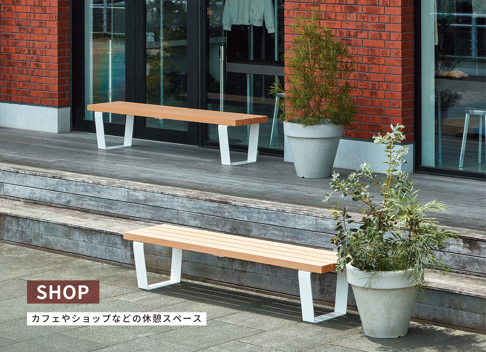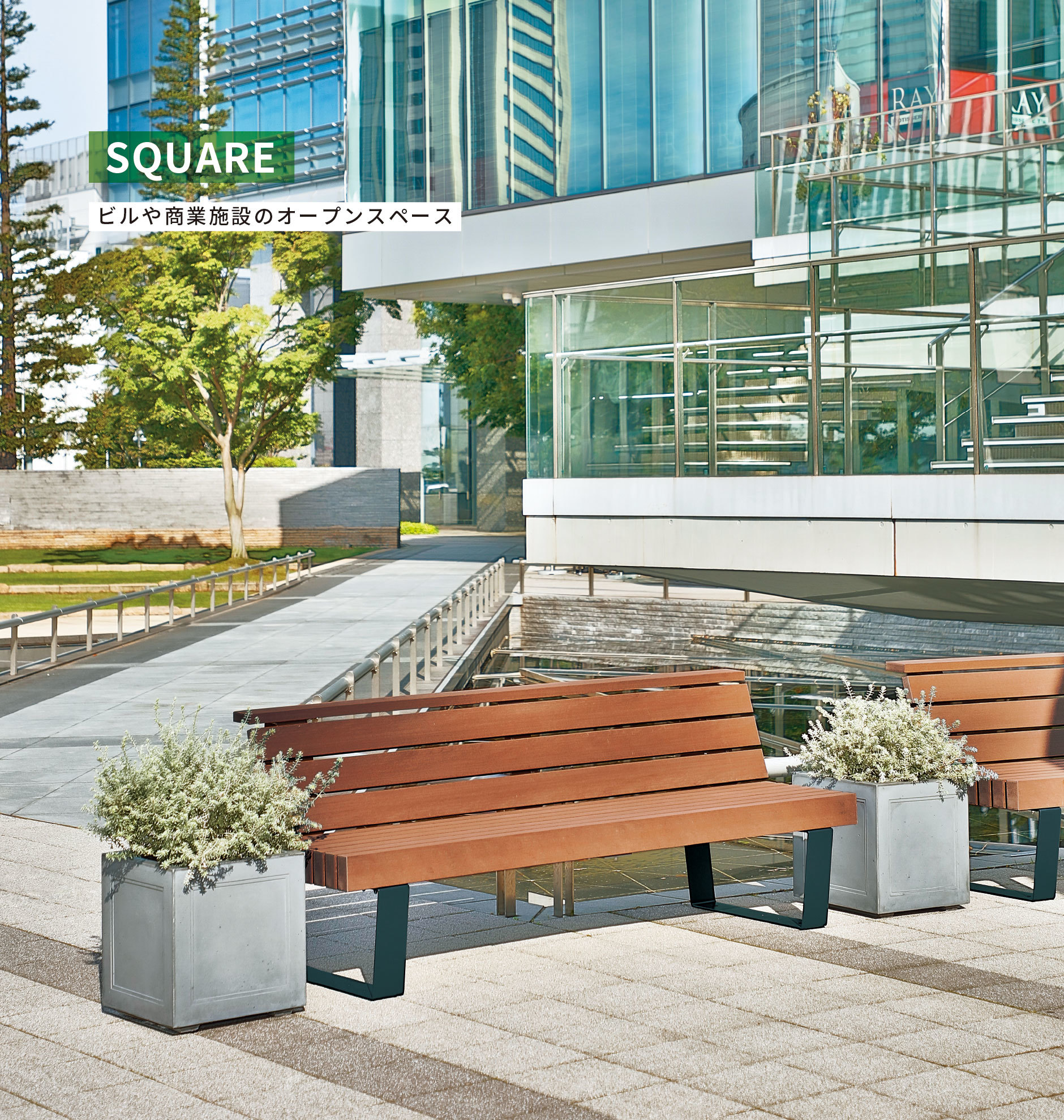 人工木製屋外家具とカラーGRC製プランターのコラボレーション 両者のプロダクトを掛け合わせより付加価値の高い空間を提案