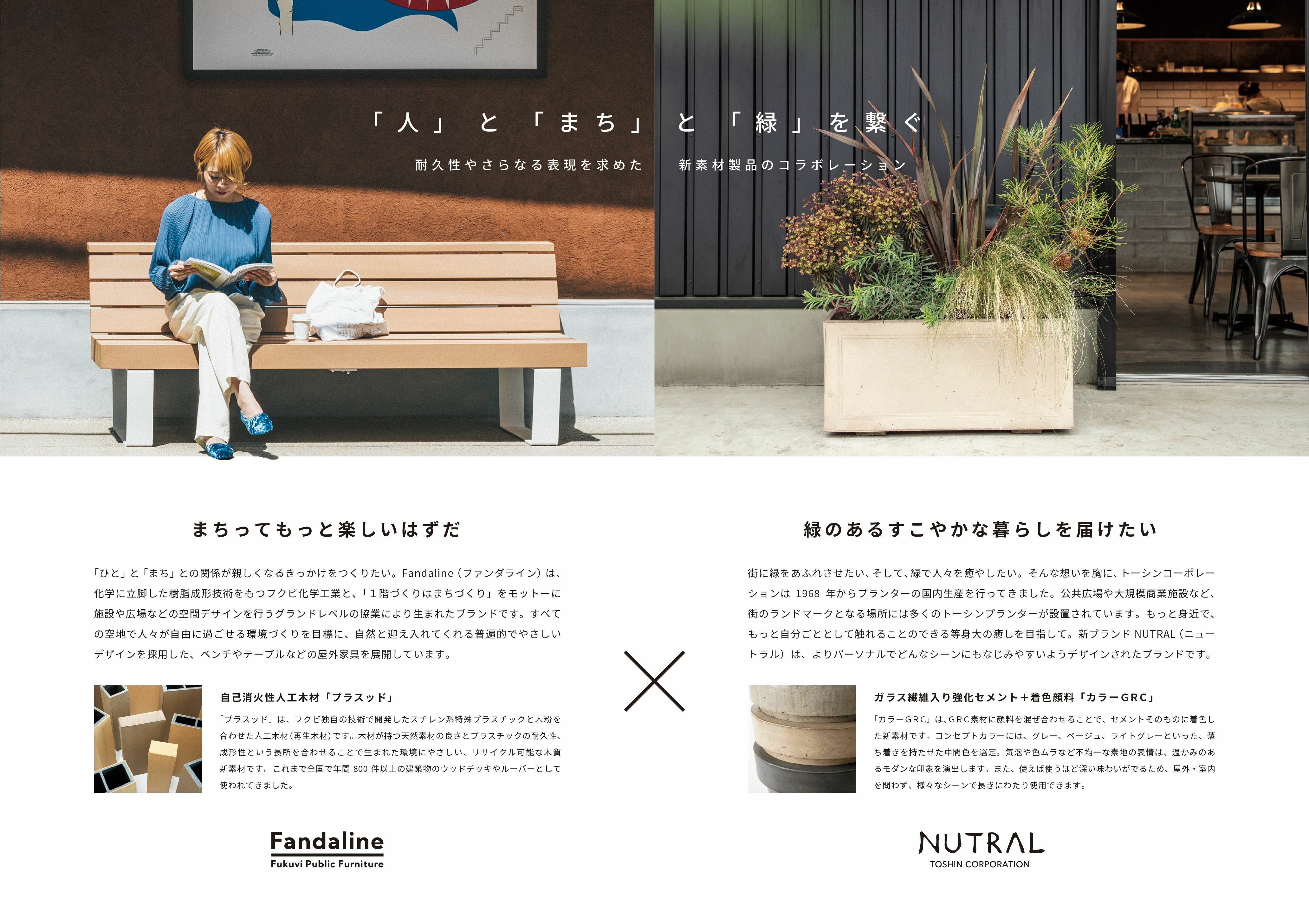 株式会社トーシンコーポレーションは、カラーGRCプランター「NUTRAL(ニュートラル)」を2021年4月より発売開始。一方、フクビ化学工業株式会社は、2021年8月に屋外家具ブランド「Fandaline(ファンダライン)」を発表し、2021年10月より販売を開始しました。株式会社トーシンコーポレーションのニュートラルとフクビ化学工業株式会社のファンダラインには、耐久性やさらなる表現を求めた新素材製品という共通点があり、お互いのプロダクトをコーディネートすることで、より付加価値の高い空間を提案できると考え、ブランドコラボレーションを行うことになりました。