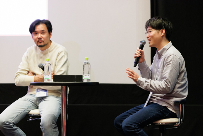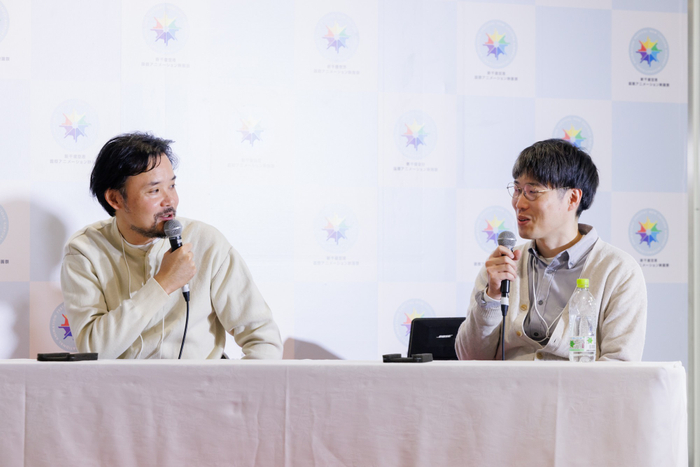 トークでは、実写映像をベースにしたアニメーション技法「ロトスコープ」の特徴や制作プロセス、ワークフローの開発、さらにキャラクターデザインの工夫などが詳しく解説されました。