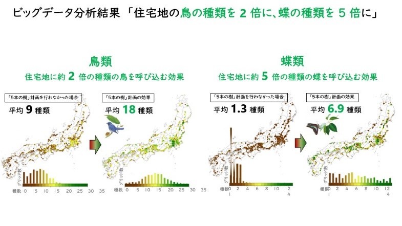 「5本の樹」計画を行うことで、行わなかった場合と比べて、住宅地に呼び込むことができる鳥の種類が2倍、蝶の種類が5倍になることがわかったのです。