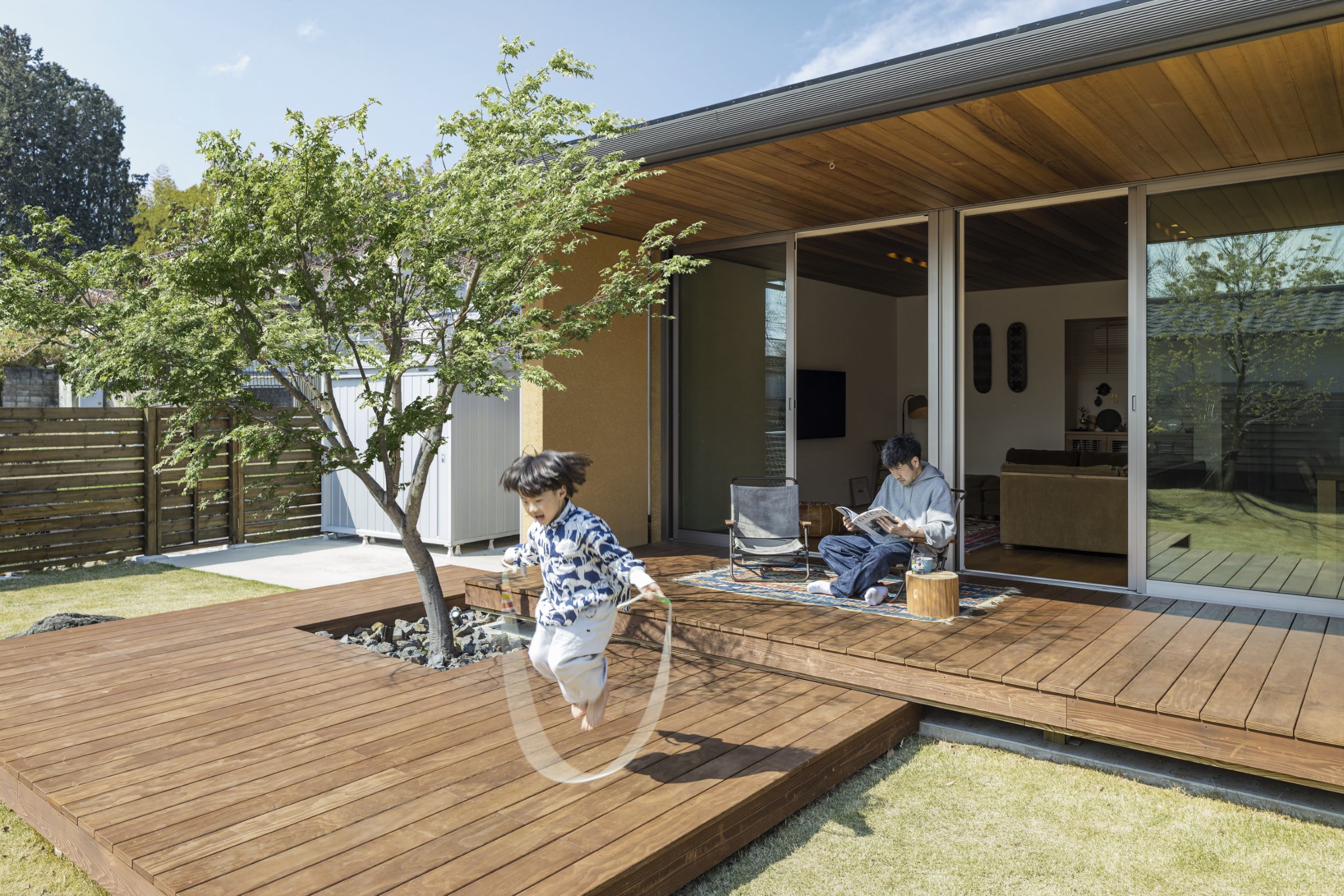 上田さん一家が家づくりの際にこだわったのが、リビングから庭へ広がるウッドデッキ。その中心に植えられたイロハモミジの木陰で、暖かい季節には昼寝をしたり、野鳥のさえずりを聞きながらの朝食をとったり…。部屋からつながる大きなウッドデッキが、部屋と外の空間をつなぐ“架け橋”となっていて、外に出ると意識しなくても、庭の緑と気軽に触れ合えるようになっています。