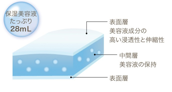 薬用保湿成分「ヘパリン類似物質」と、薬用美白※3成分「プラセンタエキス」の2つの薬用成分に加え、輪郭を引き上げながら密着できる伸縮形状の3層構造シートを採用。たっぷりの保湿美容液を角層すみずみまで浸透させ、肌全体にうるおいを届けます。