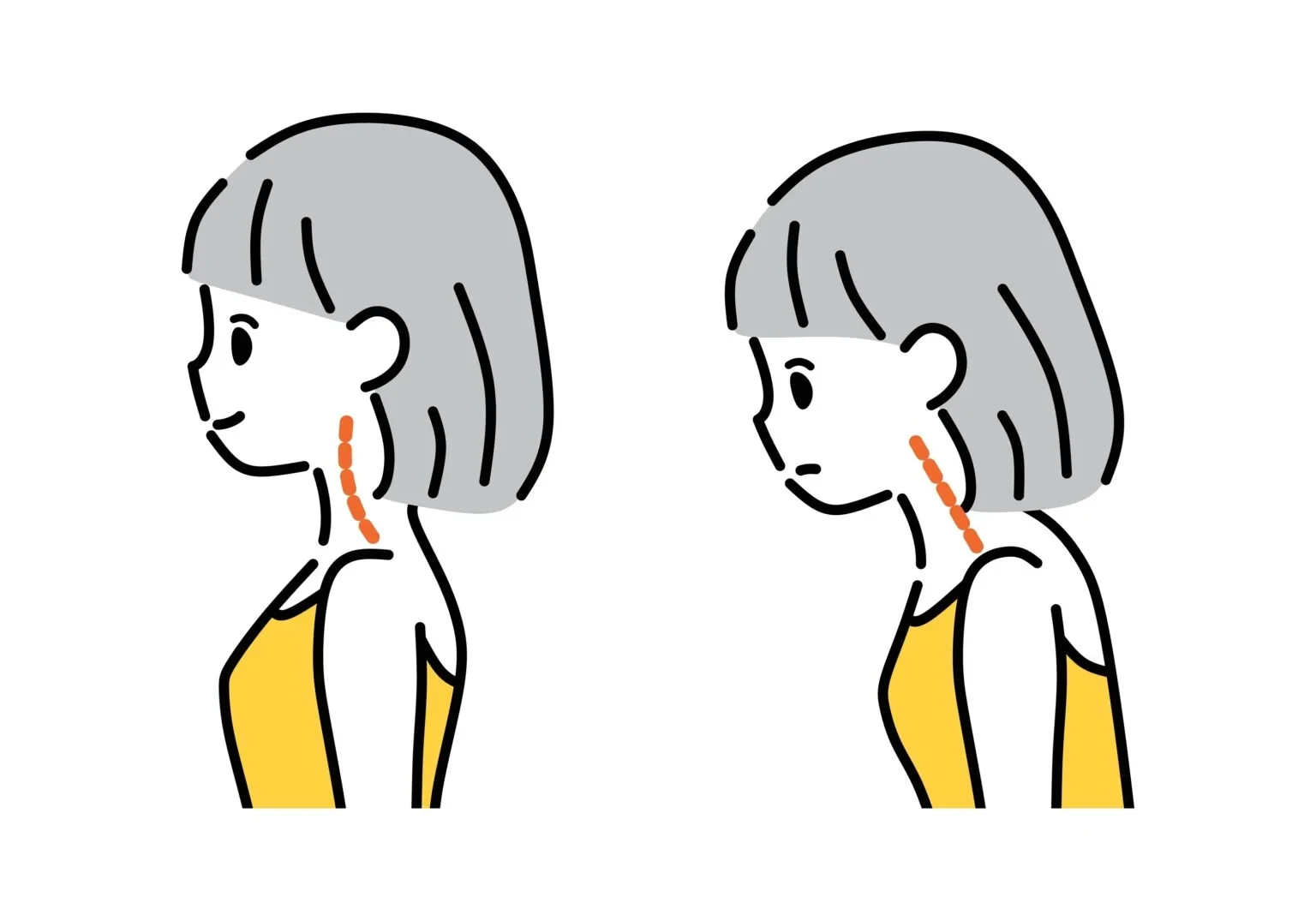 スマホやパソコンを長時間使用することで、頭が前に突き出る姿勢が習慣化し、首の自然なカーブが失われてしまうのが主な原因です。
