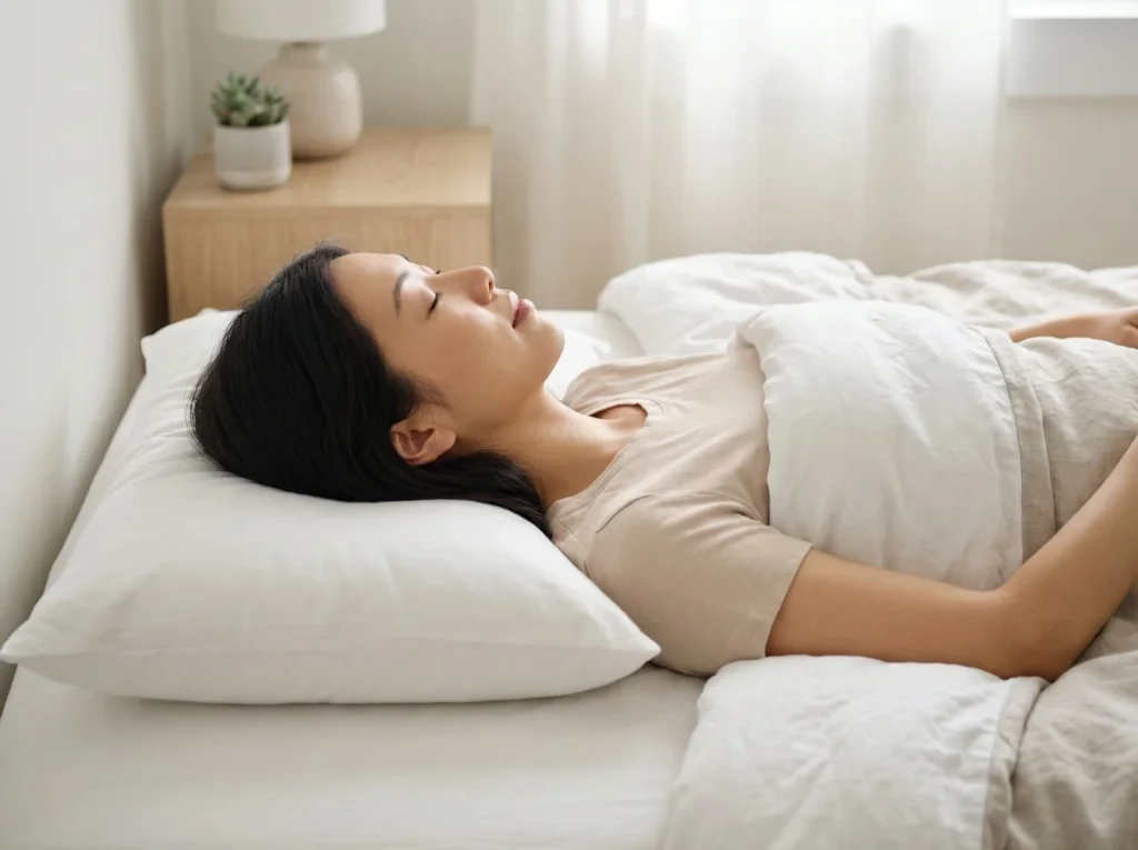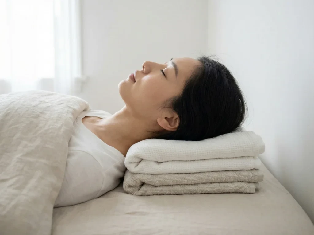 平らすぎる枕よりも、首と後頭部を分けて支えるタイプが適しています。