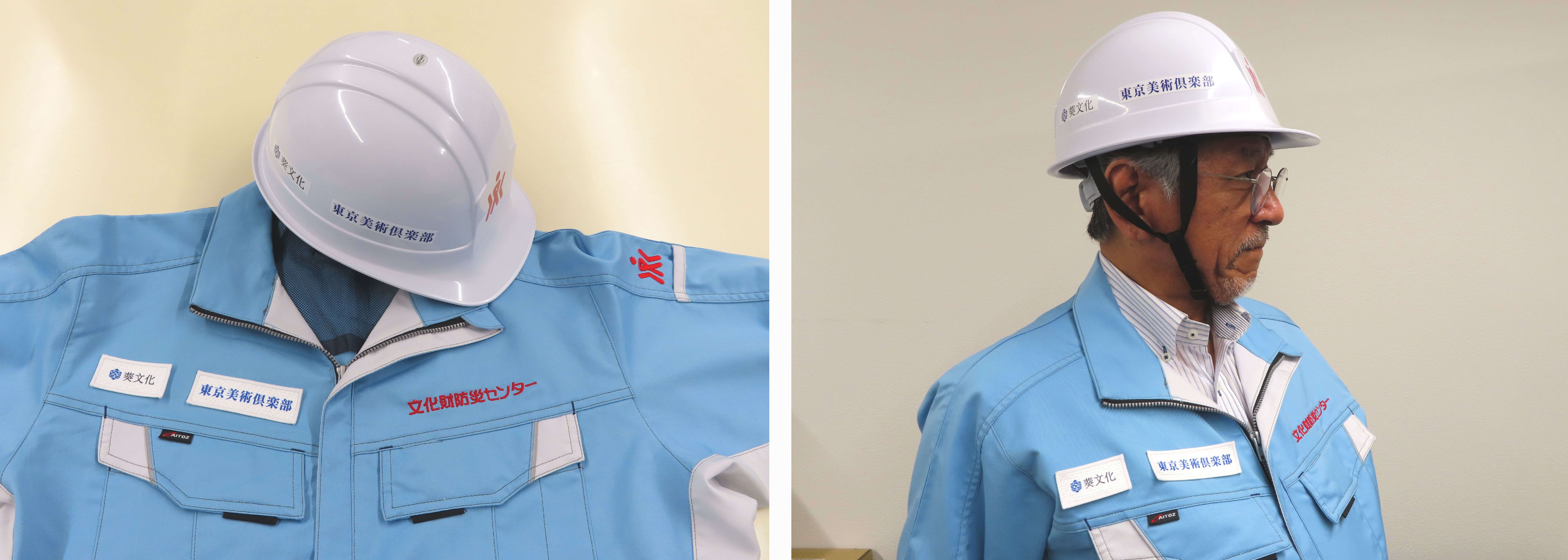 本プロジェクトでは、株式会社東京美術倶楽部(東京都港区)様と株式会社葵文化(熊本県熊本市)様より特別協賛をいただきました。ご支援に対する御礼として、文化財防災センターの職員が作業中に身に着けているヘルメットと作業着に、2社様の企業名およびロゴマークを掲出します。