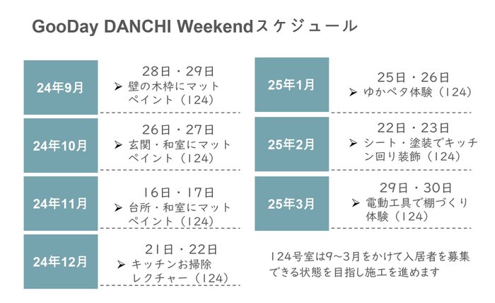 名島団地124号室では2025年3月までのワークショップ内で、少しずつDIYリノベーションを実施していきます。本物のお部屋を使いながら学べるのでより実践的なDIYスキルが身に付きます。