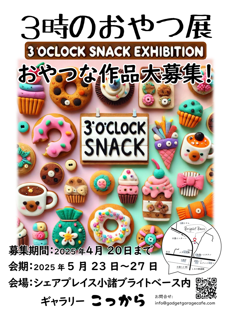 Gadget Garage Cafe(所在地:東京都三鷹市、代表:大日方 祐彦)はシェアプレイス小諸ブライトベースにある小さなギャラリー「こっから」にて、2025年5月23日~27日に「3時のおやつ展」、2025年9月26日~30日に第2回「ねこ展」を開催します。お菓子好き・猫好きな作家さん、アーティストさん、デザイナーさん、趣味の方等々の展示作品を募集します。