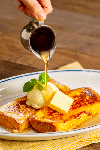 メゾンカイザーのパンをアパレイユにじっくり漬け込みフレンチトーストにしました。バニラアイスやバター、メイプルシロップと一緒にお召し上がりください。
