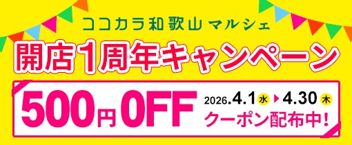 「ココ・カラ。和歌山マルシェ」は、和歌山県内8JAが令和7年4月1日に合併したのに合わせ、旧6ショップが一緒になりオープンしたショップで、和歌山県が生産量日本一を誇る梅、ミカン、柿などの青果物や、梅干、ジンジャーエールなどの農産加工品に加え、野菜や花、熊野牛など充実した商品を取り揃えているショップです。開業1周年記念としてお得な割引クーポンを発行します。ぜひこの機会にご利用ください。