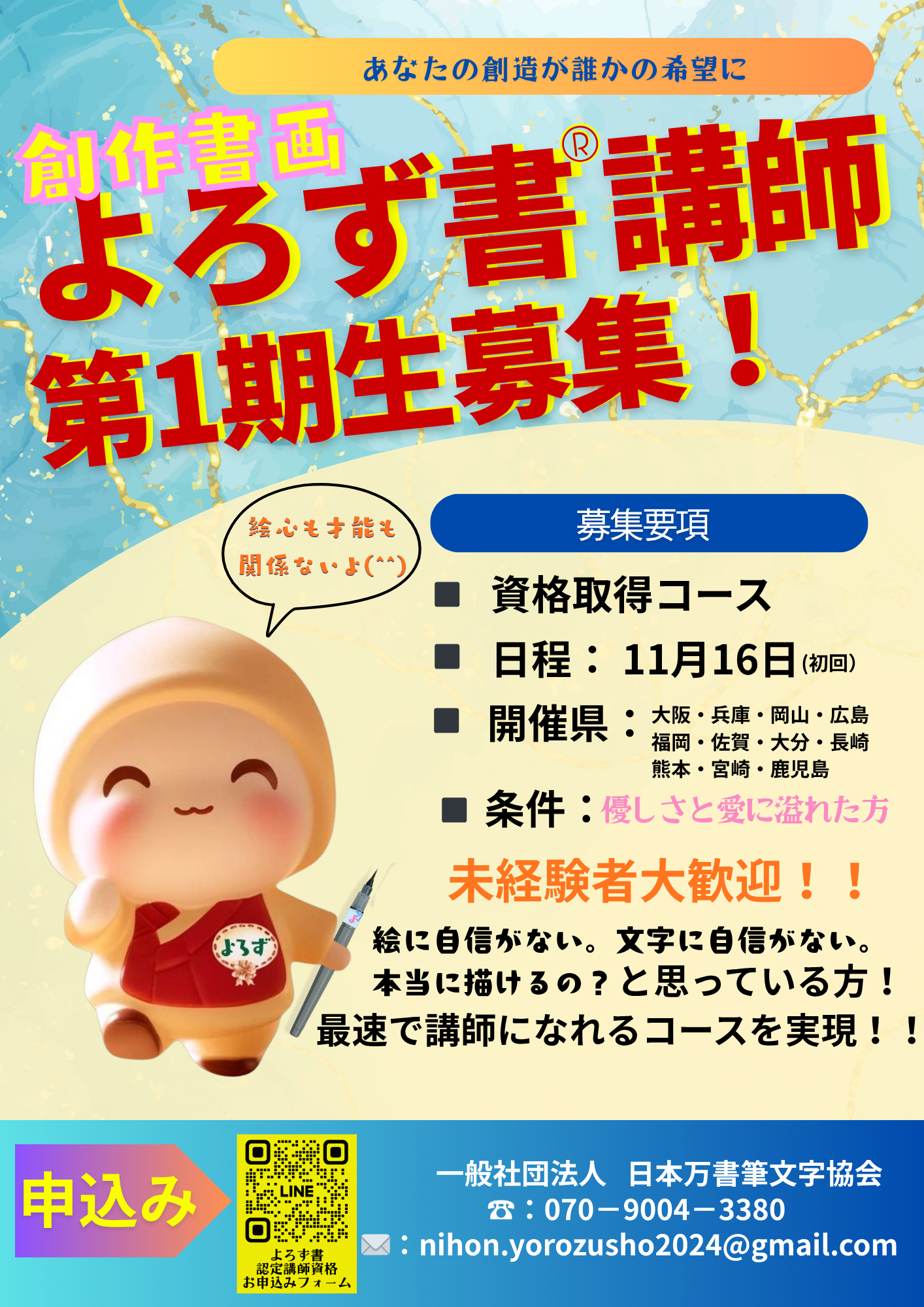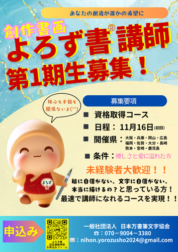 一般社団法人日本万書筆文字協会(所在地:鹿児島市南林寺町19-3、代表理事:北薗純子)は、AI(人工知能)によるお題作成技術を導入。デジタルとアナログの融合を実現した新しい筆文字アート「創作書画よろず書®」の認定講師を養成する「第 1 期 認定講師資格コース」を、2025 年11 月 16 日より西日本 11 県で一斉に開講します。本コースは、絵や文字に自信がない未経験者でも、わずか 3 日間の短期集中講座で講師資格の取得を目指せる独自のカリキュラムを提供します。デジタル化が加速する現代において、アナログな創作活動の新たな可能性を切り拓き、地域社会における文化振興及び自己実現の機会を創出することを目的としています。