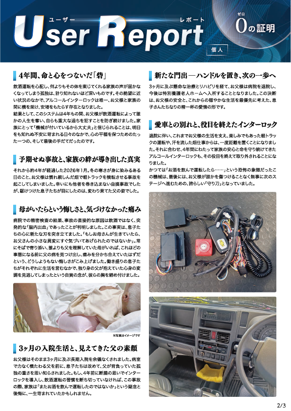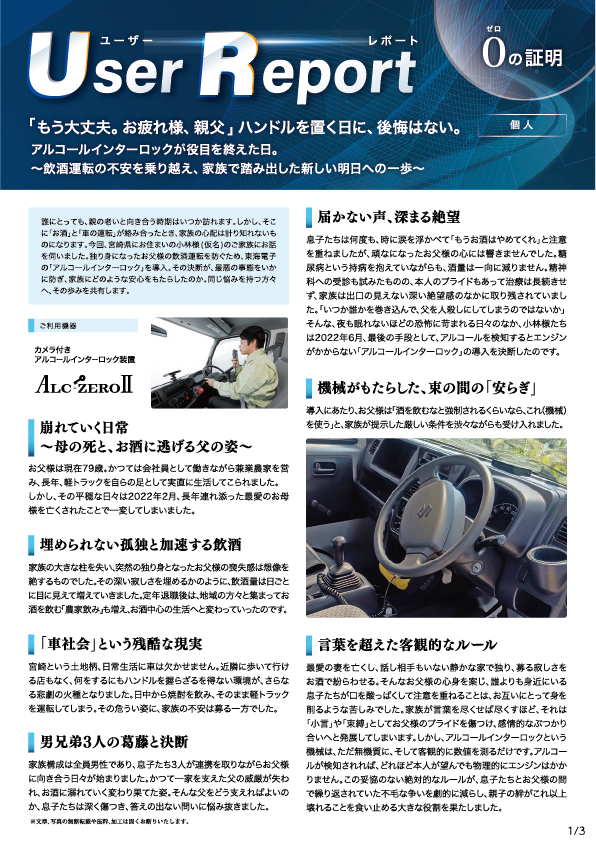 本レポートでは、宮崎県にお住まいのご家族が、独り身となった79歳のお父様の飲酒運転への不安と向き合い、アルコール・インターロック導入を決断した背景と、その後約4年にわたり家族の安心を守り続けてきた実態を紹介しています。