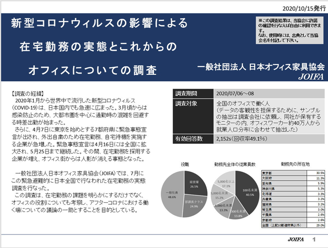 一般社団法人日本オフィス家具協会は、「新型コロナウィルスの影響による在宅勤務の実態とこれからのオフィスについての調査」と題する報告書を公表しました。この報告書は緊急事態宣言解除後の2020年7月上旬に全国のオフィスワーカーを対象に実施した調査の結果に考察を加えたものです。