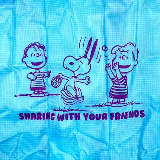 爽やかなブルーカラーです。みんなで遊んでいる風景が描かれたデザイン♪スヌーピーのお耳がピーン!の可愛いイラストが良い感じ♡