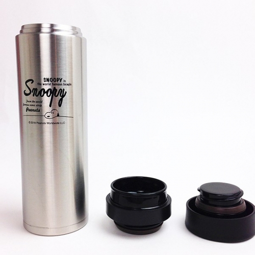 イチオシは、おしゃれなカフェの雰囲気にもばっちり合う、こちらのスタイリッシュなステンレスボトルです!大人の男性でも抵抗なく持てそうなシンプルなデザインですが、ちゃんとスヌーピーのイラスト入り♪
