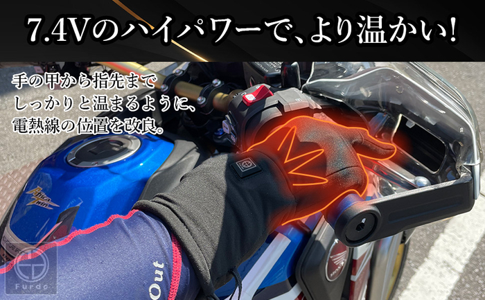 このインナーヒーターグローブは、7.4Vのハイパワーのため従来品(3.7V)よりもさらに温かく、しかも約10秒という速さで暖かさを伝えてくれます。