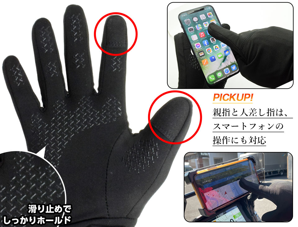 親指と人差し指の指先に加工を施しているので、スマホ操作やナビ操作などを快適に行うことができます。