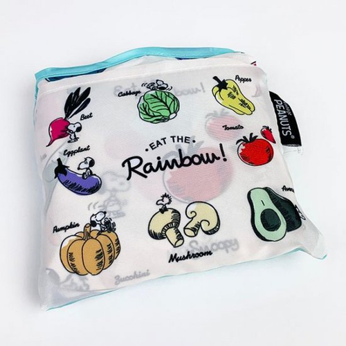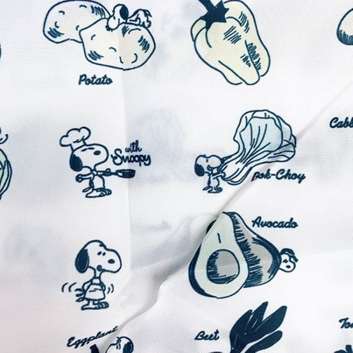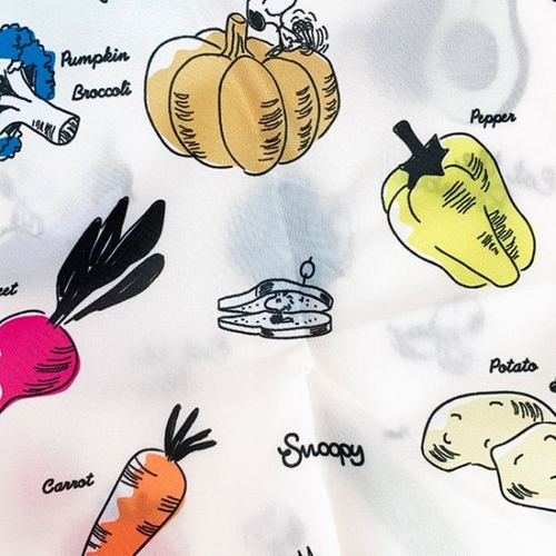 ニンジンやトマト、ジャガイモやキャベツなど、さまざまな野菜がチラシ柄になっています。よく見ると、野菜に乗っかったスヌーピーやコック帽姿のウッドストックも♪楽しくなるデザインです。